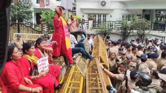 पुलिस ने बैरिकेडिंग कर प्रदर्शनकारियों को रोक दिया। कांग्रेसियों ने इस दौरान जमकर नारेबाजी की। महिला कांग्रेस कार्यकर्ता वहीं पर धरने पर बैठ गईं। कांग्रेस ने प्रदेश में महिलाओं के खिलाफ बढ़ते अपराधों की बात कहते हुए भाजपा पर हमला बोला।