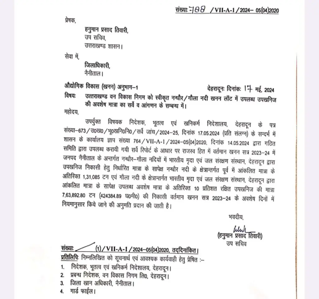 Uttarakhand News 17 May 2024: औद्योगिक विकास (खनन) अनुभाग-1 विषयः उत्तराखण्ड वन विकास निगम को स्वीकृत नन्धौर/गौला नदी खनन लॉट में उपलब्ध उपखनिज की अवशेष मात्रा का सर्वे व आंगणन के सम्बन्ध में।