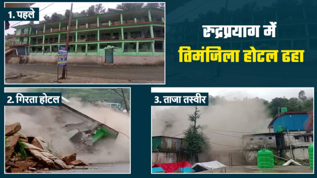 Uttarakhand News, 08 August 2023: रुद्रप्रयाग: उत्तराखंड में सोमवार से मौसम ने एक बार फिर से करवट बदली और एक बार फिर से पहाड़ों पर आफत आ गई है। कल शाम से शुरू हुई बारिश मंगलवार को भी जारी है। कई इलाकों में भारी बारिश के चलते सड़के नदी में तब्दील हो गई हैं, तो कहीं भूस्खलन से लोगों की जान आफत में आ गई है। मंगलवार को एक तीन मंजिला होटल इसी भूस्खलन के चलते धराशायी हो गया। रुद्रप्रयाग के रामपुर में भूस्खलन के कारण 32 कमरों का एक तीन मंजिला होटल पालक झपकते ही जमींदोज हो गया। इसका वीडियो भी सोशल मीडिया पर वायरल हो रहा है। खास बात ये रही कि उस होटल में कोई नहीं था, वरना बड़ा हादसा हो सकता था।