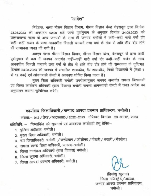 अतएव भारत मौसम विज्ञान विभाग, मौसम विज्ञान केन्द्र, देहरादून के द्वारा जारी पूर्वानुमान के क्रम में जनपद अन्तर्गत कहीं-कहीं भारी वर्षा एंव कहीं-कहीं गर्जन के साथ आकाशीय बिजली चमकने तथा वर्षा के तीव्र से अति तीव्र दौर होने की सम्भावना के दृष्टिगत दिनांक 24.08.2023 को जनपद में संचालित शासकीय, गैर शासकीय, निजी विद्यालयों में (कक्षा 1 से 12 तक) एवं आंगनबाड़ी केन्द्रों में अवकाश घोषित किया जाता है। मुख्य शिक्षा अधिकारी चमोली उपरोक्तानुसार जनपद अन्तर्गत समस्त विद्यालयों एंव जिला कार्यक्रम अधिकारी (बाल विकास) चमोली समस्त आगनवाडी केन्द्रो में उक्त आदेश का अनुपालन कराना सुनिश्चित करेगें ।