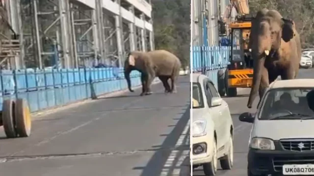 Uttarakhand News 23 Dec 2024: Elephant in Rishikesh: राजाजी राष्ट्रीय पार्क के जंगल से निकलकर एक हाथी बैराज पुल होते हुए एम्स रोड पहुंच गया। हाथी के आने से पुल से लेकर एम्स रोड पर अफरातफरी मची रही।