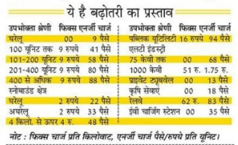 अघरेलू श्रेणी के टैरिफ में औसत 12.66 प्रतिशत, सिंगल प्वाइंट बल्क सप्लाई में 13.14 प्रतिशत, गवर्नमेंट पब्लिक यूटिलिटी में 12.54 प्रतिशत, निजी नलकूप श्रेणी में पांच प्रतिशत, इंडस्ट्री में 11.91 प्रतिशत, मिश्रित भार के टैरिफ में 12.56 प्रतिशत, रेलवे ट्रैक्शन के टैरिफ में 13.54 प्रतिशत, विविध चार्जेज में 5% बढ़ोतरी का प्रस्ताव दिया गया है।