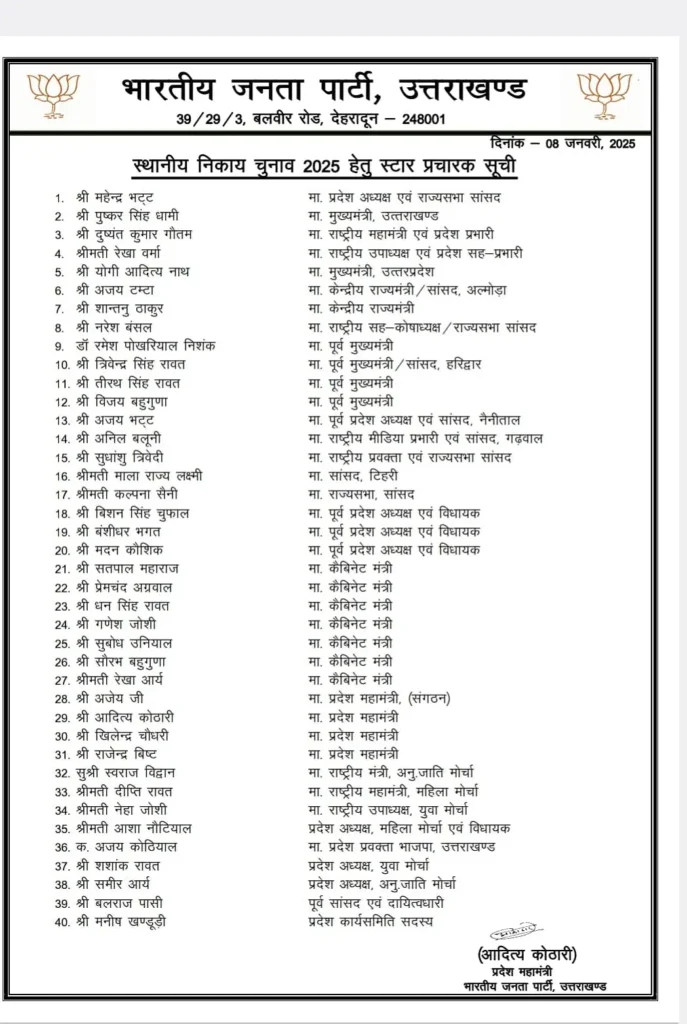 Uttarakhand News 09 Jan 2025: उत्तराखंड में नगर निकाय चुनाव में प्रचार के लिए भाजपा ने स्टार प्रचारकों की सूची जारी कर दी है। पार्टी ने सीएम योगी आदित्यनाथ और सीएम धामी समेत 40 दिग्गज नेताओं को मैदान में उतारा है। पार्टी ने प्रचार के लिए कई पूर्व सीएम और विधायकों को भी शामिल किया है।
