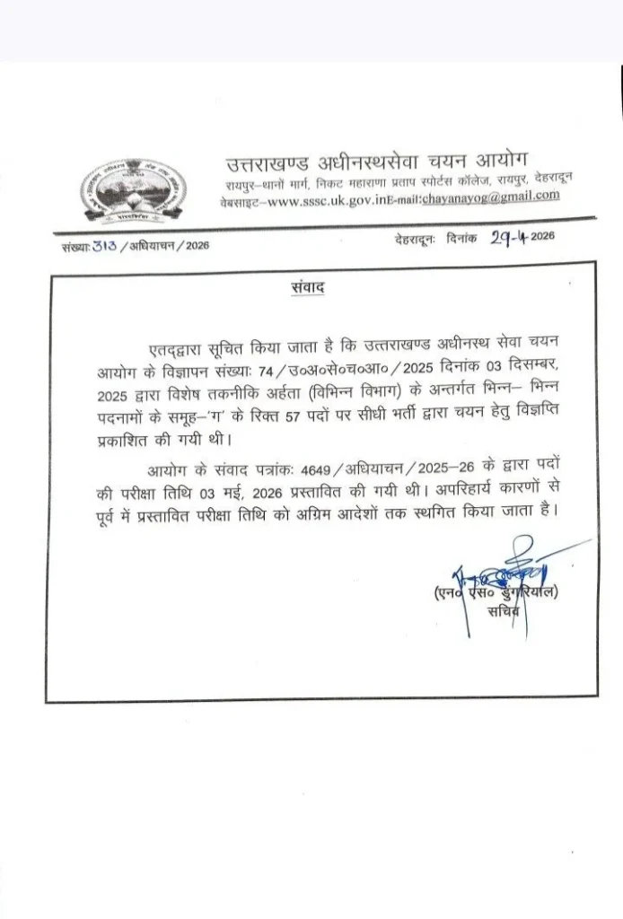 Uttarakhand News 29 April 2026: उत्तराखंड अधीनस्थ सेवा चयन आयोग ने विशेष तकनीकी अर्हता (विभिन्न विभाग) के तहत आयोजित होने वाली भर्ती परीक्षा को स्थगित कर दिया है। यह परीक्षा 3 मई 2026 को प्रस्तावित थी।