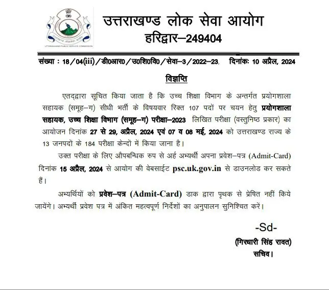 Uttarakhand News 11 April 2024: देहरादून – एतद्वारा सूचित किया जाता है कि उच्च शिक्षा विभाग के अन्तर्गत प्रयोगशाला सहायक (समूह-ग) सीधी भर्ती के विषयवार रिक्त 107 पदों पर चयन हेतु प्रयोगशाला सहायक, उच्च शिक्षा विभाग (समूह-ग) परीक्षा-2023 लिखित परीक्षा (वस्तुनिष्ठ प्रकार) का आयोजन दिनांक 27 से 29, अप्रैल, 2024 एवं 07 व 08 मई, 2024 को उत्तराखण्ड राज्य के 13 जनपदों के 184 परीक्षा केन्दों में किया जाना है।