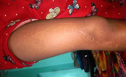 सहिजना निवासी देवेंद्र राठौर की पुत्री साक्षी (8) माधौगंज कस्बे के एक प्राइवेट विद्यालय में कक्षा एक की छात्रा है। उसके शरीर पर राधे-राधे, राम-राम, गुरुदेव सहित उसका व परिवार के लोगों के नाम और अंक उभर रहे हैं। देवेंद्र के मुताबिक, पिछले 20 दिनों से साक्षी अपने शरीर पर लाइनें बनाती थी, जो खरोंच जैसी लगती थीं।